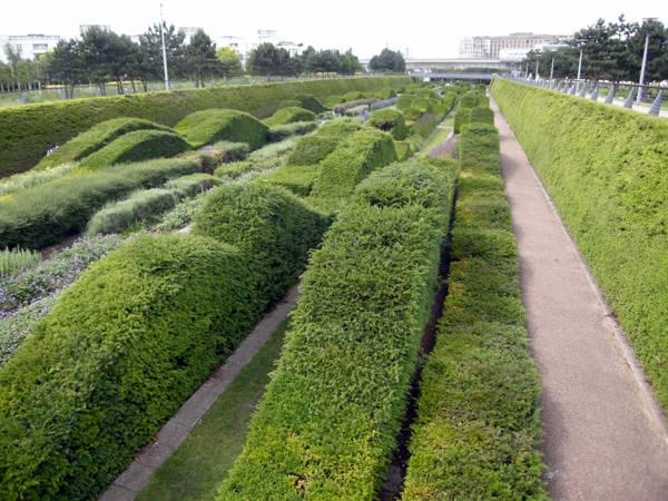 泰晤士河壩公園以前是用于化學和染色工藝的工業區,嚴重污染了土壤及地下水。現在不同了,波浪式的樹籬展示該地區港區的歷史。公園有強烈對比的斜線,分割了前往河流方向的矩形花園。該公園不僅吸引游客,還歡迎公園周邊的居民來游玩,因為它有運動場、噴泉廣場以及籃球場。公園里充滿強烈的歷史主題氣息,主要是因為選擇的植物以及靠近甲板的地理位置。