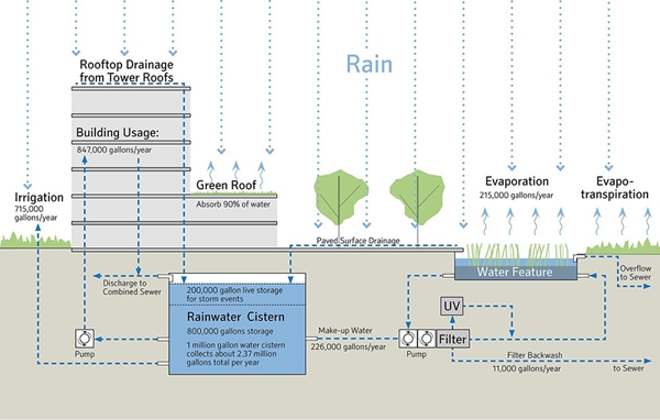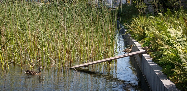 雨水收集看似簡單,但它是維持復(fù)雜的生態(tài)系統(tǒng)的關(guān)鍵所在。在項(xiàng)目開始時(shí),私建雨水收集系統(tǒng)在西雅圖還是非法的。景觀設(shè)計(jì)師和工程團(tuán)隊(duì)曾與基金會(huì)、西雅圖市和金縣一起同華盛頓國務(wù)院生態(tài)管理署爭論“水權(quán)”是不必要的。這個(gè)論點(diǎn)很簡單:在城市化地區(qū),由于所有降雨都將進(jìn)入合并的雨水排水系統(tǒng),超出基礎(chǔ)設(shè)施負(fù)荷,收集和再利用雨水用于現(xiàn)場可以產(chǎn)生更大的益處。實(shí)施這一新方法管理水資源已經(jīng)為周圍流域的健康做出了貢獻(xiàn)。