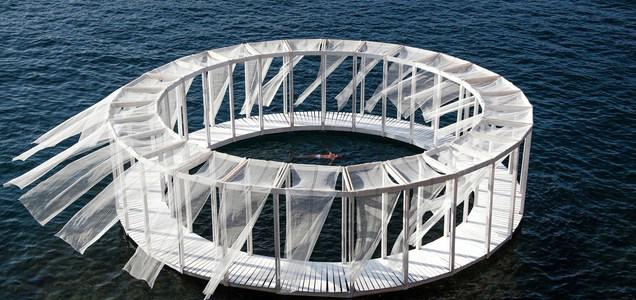 木造的結構體創造了一個分隔的空間,外脫離于無垠大海的廣闊天地,內圍合出一塊小水池。它是永無止境的柱廊,不朽的環形廟宇,意圖要游離在時間的概念之外。宛如漂浮在藍天上的白色云朵,它是漂浮在碧藍大海上的白色空間。因漂浮不定而顯得輕盈優雅。