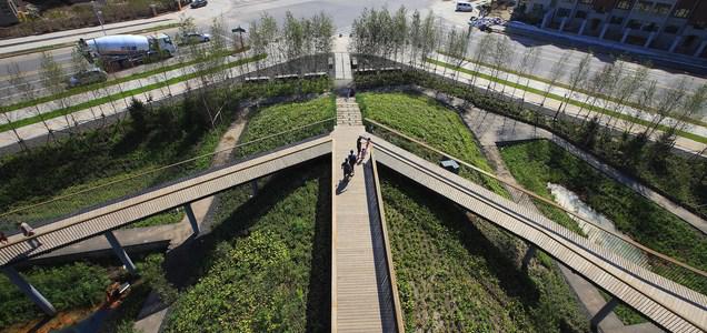 該公園保留場地中部的大部分區域作為自然演替區,沿四周通過挖填方的平衡技術,創造出一系列深淺不一的水坑和高地不一的土丘,成為一條藍-綠項鏈,形成自然與城市之間的一層過濾膜和體驗界面。沿四周布置雨水進水管,收集城市雨水,使其經過水泡系統經沉淀和過濾后進入核心區的自然濕地,山丘上密植白樺林,水泡中為鄉土水生和濕生植物群落。高架棧橋連接山丘,布道網絡穿越于丘林。水泡中設臨水平臺,丘林上有光觀亭塔之類。這樣創造出豐富多樣的體驗空間。