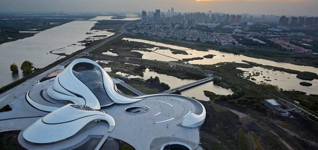 該建筑由一大一小2個音樂廳以及一個偌大的公共空間組成,3個主要空間通過一個“絲帶”似的建筑屋頂連接在一起,露出來的部分鋼結構玻璃幕墻屋頂仿佛絲帶包裹住的一顆寶石,閃爍在松花江畔,由MAD(馬巖松工作室)完成。