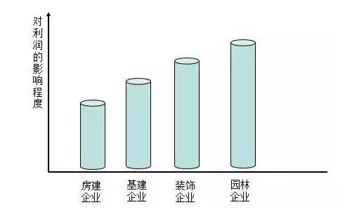 “營改增”顧名思義就是對以前繳納營業(yè)稅的應稅項目改成繳納增值稅?!盃I改增”對建筑業(yè)不同子行業(yè)及同一子行業(yè)內不同企業(yè)的稅負、利潤指標有不同的影響,關鍵在于增值稅進項稅可抵扣比例不一樣。那么“營改增”對建筑細分行業(yè)的影響有什么不同?我們大致將建筑細分行業(yè)分為四個:房屋建筑、基建、裝飾、園林。下圖是四個行業(yè)的企業(yè)利潤所受到的影響程度: