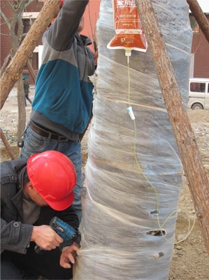 技術人員首先用電鉆在樹干根頸部位45°角鉆開一個小孔,然后將輸液管插入其中,將輸液瓶吊于樹上,吊瓶中的液體通過輸液管流進樹干中。輸液瓶里富含植物所需的各種營養成分以及微量元素,項目部針對樹況的不同適時添加殺菌劑和殺蟲劑。