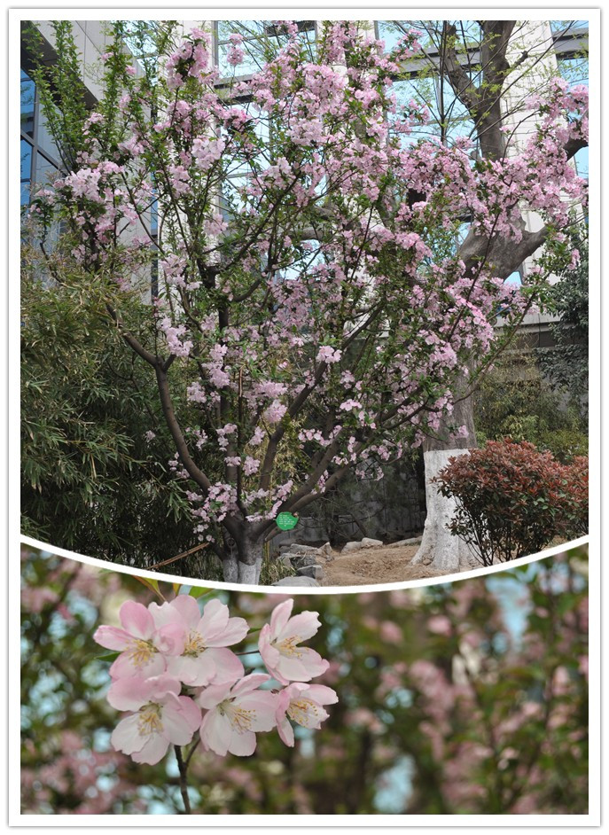 垂絲海棠是薔薇科蘋果屬的植物,屬落葉小喬木4~5月開放。垂絲海棠柔蔓迎風,垂英鳧鳧,如秀發遮面的淑女,脈脈深情,風姿憐人。宋代楊萬里詩中:“垂絲別得一風光,誰道全輸蜀海棠。風攪玉皇紅世界,日烘青帝紫衣裳。懶無氣力仍春醉,睡起精神欲曉妝。舉似老夫新句子,看渠桃杏敢承當?!毙稳菅G的垂絲海棠鮮紅的花瓣把藍天、天界都攪紅了,閃爍著紫色的花萼如紫袍,柔軟下垂的紅色花朵如喝了酒的少婦,玉肌泛紅,嬌弱乏力。其姿色、妖態更勝桃、李。垂絲海棠性喜陽光,不耐陰,也不甚耐寒,愛溫暖濕潤環境,適生于陽光充足、背風之處,土壤要求不嚴,不耐水澇。海棠不僅花色艷麗,其果實亦玲瓏可觀。至秋季果實成熟,紅黃機映高懸枝間,恰似紅燈點點,乘風蕩漾,別具風姿。