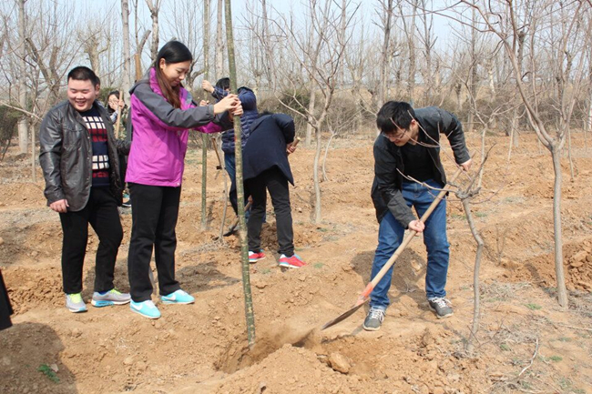 十年樹木,百年樹人。本次植樹交友活動以植樹活動為主線,成功融入了青工交流、團隊建設、交友聯誼等元素。在前往苗圃途中,專業素質拓展教練就通過“記名字”游戲,讓大家迅速“破冰”,積極主動交流。植樹前,大家按照教練指揮,分為四隊推選出隊長、“隊秘”和隊歌,集體展示了團隊口號和標志造型,并在“石頭剪刀布”接力比賽中,拉近了彼此距離,展現了團隊力量。在苗圃工作人員的指導下,四支隊伍展開了熱火朝天的植樹比賽,歷時一個多小時,150余棵國槐樹苗便已在春風中搖曳生姿。隨后,大家寫下了植樹寄語銘牌,讓青春的無限夢想伴隨著樹苗一同成長。