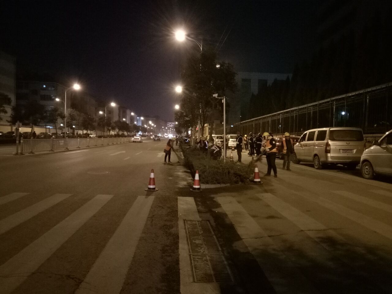 匯友市政園林集團順時安排下去,由分公司副經理王紅磊統籌安排,項目經理謝艷清進行人員調動與現場施工。接到本次任務已是下午三時,較短時間的組織機械、籌備隊伍進行工程策劃對淡季的園林公司來說比較棘手,材料設備部與安全環保部的完美配合,不到2個小時的時間機械、物資、人力都全面到位等待夜間施工的到來。