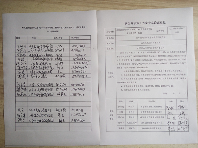 7月19日,在山東黃河國際生態城管委會會議室,召開了齊河縣黃河國際生態城G309景觀綠化工程施工項目第一標段工程人工頂管安全專項施工方案論證會。此次會議邀請了山東省深基礎工程勘察院研究員羅永現、山東建筑大學副教授邵廣彪、山東建材勘察測繪研究院高工陳明本等專家。